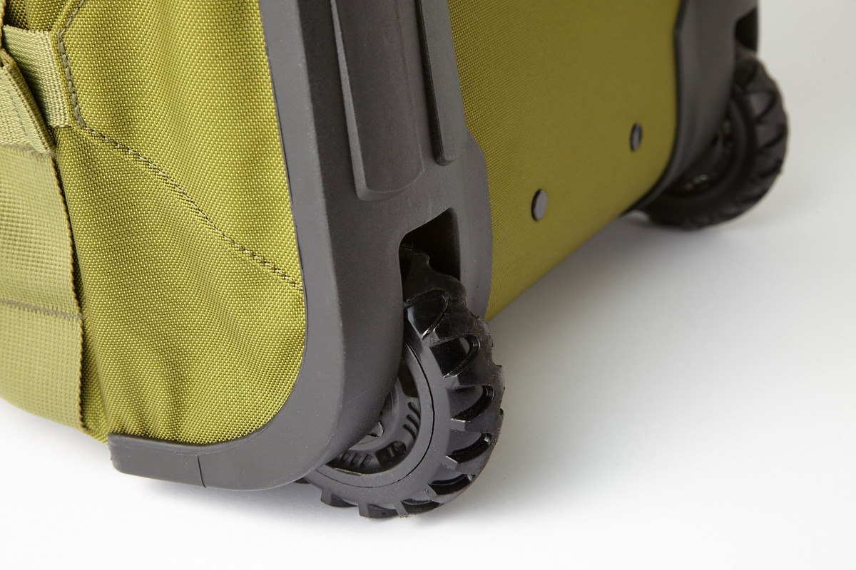 ▲大径でタフな2輪ホイールを搭載。石畳はもちろん、舗装されていない道路でも取り回しやすいのが◎。さすがはアウトドアブランドのキャリーケースだ