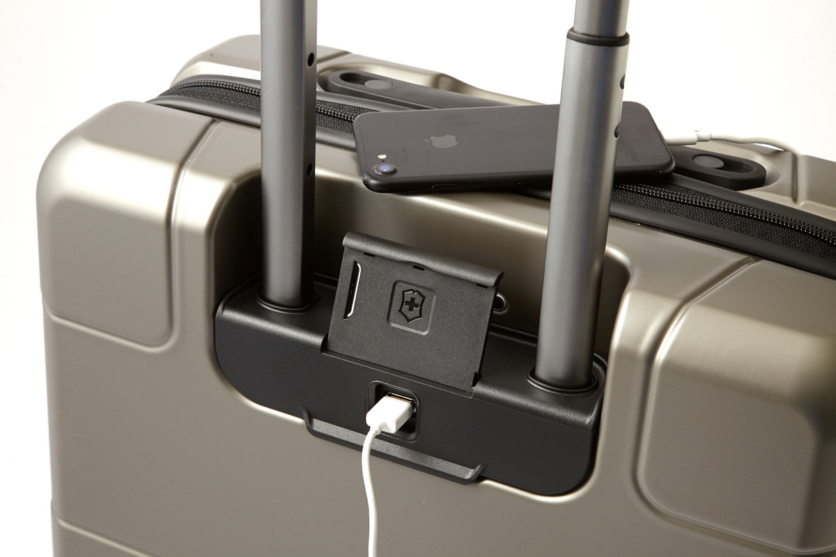▲ハンドルの根元にスライド式IDタグを内蔵。USBポート付きのため、空港のロビーなどで待ち時間にスマホを充電できる