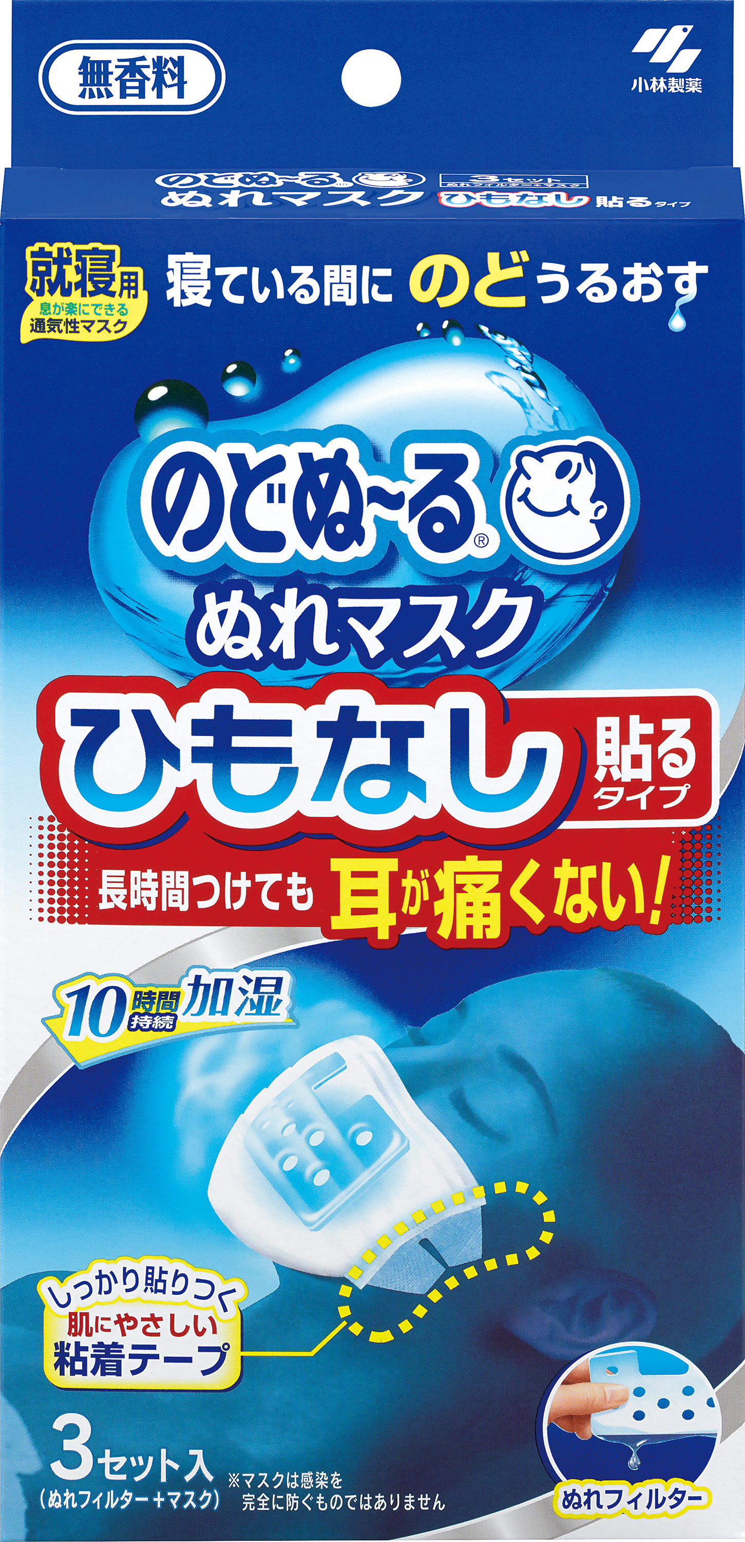 昼間に使用するマスクをご紹介してきましたが、寝るときに使用するマスクも重要ですよね。寝ている間にマスクが取れてしまう経験を誰もが一度はしているのではないでしょうか。「のどぬ〜るぬれマスク ひもなし貼るタイプ」はその名の通り耳ひもをなくし、肌に優しい粘着素材のテープを直接顔に貼ることで固定するタイプの就寝用マスクです。濡れフィルターをマスク内側のポケットに入れると、フィルター内の水分が蒸気になり、寝ている間の喉を潤してくれます。