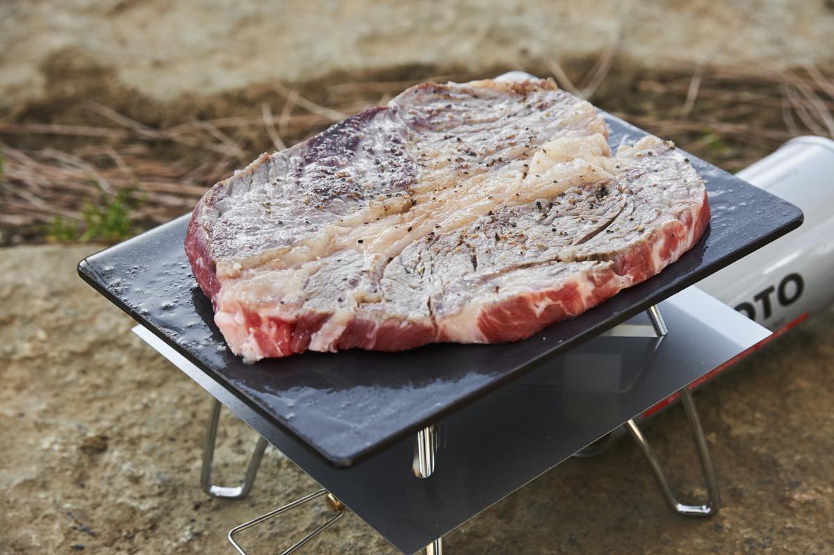 野外で食べる豪快料理といえばステーキ。何で焼いても同じでしょと思うかもしれないが、実は違う。調理道具によって味は驚くほど変化する。もっともおすすめしたいのは鉄板。熱が逃げにくく食材にきちんと火が通る、という鉄の特性によって肉がふっくら美味しく焼き上がるのだ。