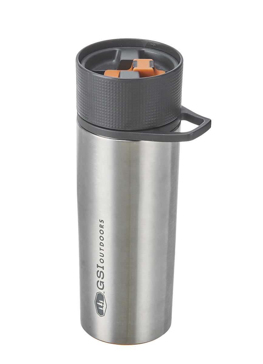 ステンレス製のインナーカラフェとタンブラー、飲み口付きの蓋からなるフレンチプレス。抽出は手軽で、そのまま持ち歩けるため、キャンプよりも釣りやカヌーといったアクティビティの際、特に重宝する。