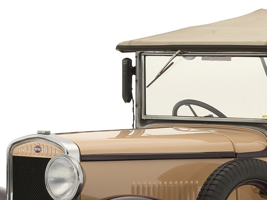 このクルマは’35年式のダットサン14型ロードスター。Aピラーについた黒いものが矢羽式方向指示器です。ちなみに矢羽式方向指示器が登場する前は、車体の後ろに付いた「LEFT」「RIGHT」という文字盤を手動で操作していたそうです。