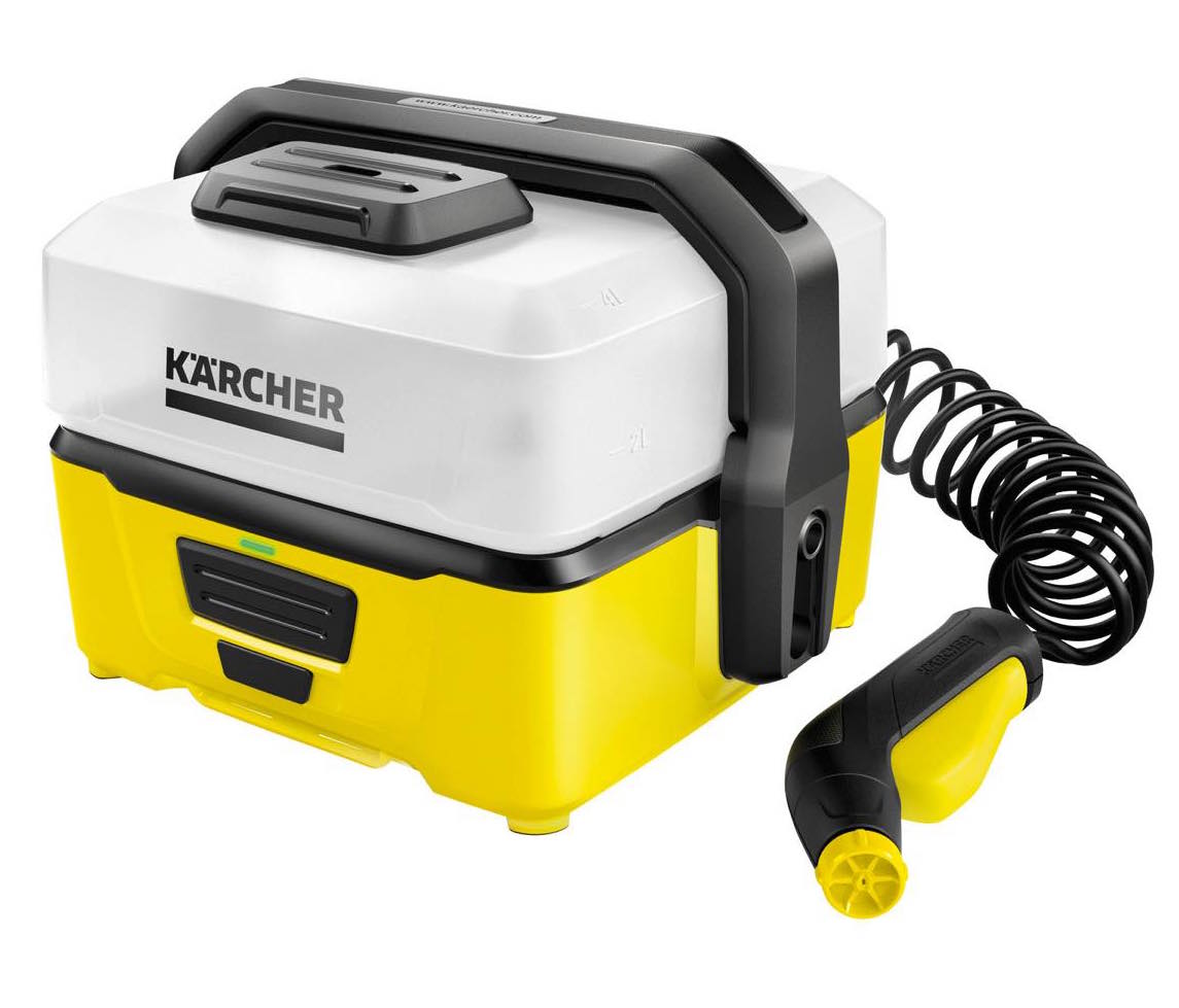 4ℓの給水タンクを備え、ホースで吸い上げた水をトリガーガンから噴射できる家庭用洗浄機。バッテリー式なので電源が取れない場所でも使えるのが魅力。フラットジェットノズルの採用により、低圧でも汚れをしっかり落とせる。