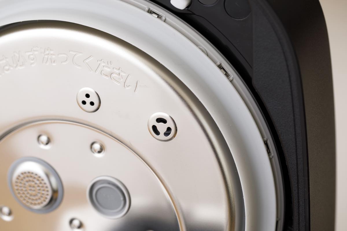 ▲内蓋のセンサーが、炊飯中の減圧時間の差からお米の乾燥状態を認知する“鮮度センシング”機能を搭載。乾燥米にはより圧力を掛けてパサつきを抑え、甘みをしっかりと引き出せる