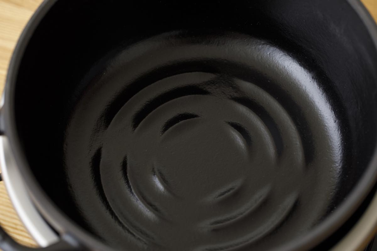 ▲鍋底には気泡の発生を促すために、水紋上のリブが付けられている。炊飯後の“飯返し”がしやすいよう段差はわずかで、しゃもじが引っ掛からない