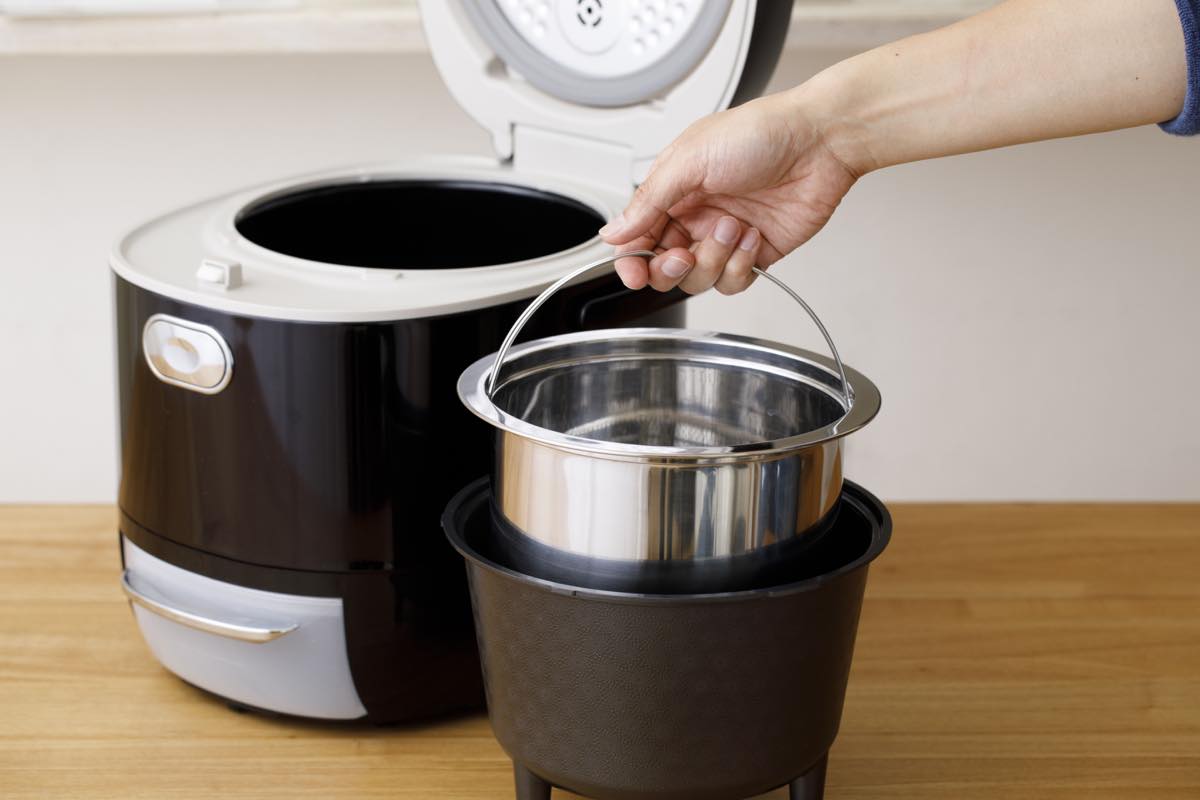 ▲お米は底に穴の空いたザルのような内釜にセット。外釜には排水する分も含めた水を入れて炊飯する。外釜に備える“足”は給排水を行うためのもの