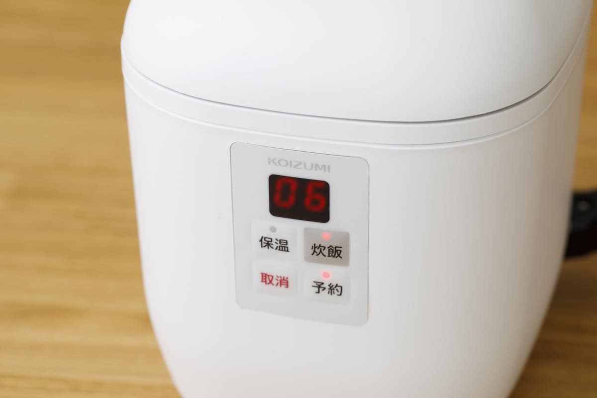 ▲「炊飯」「予約」「保温」「取消」といった4つのボタンを本体正面に配置。 タイマー機能を備え、最長12時間後までの炊飯予約を行える