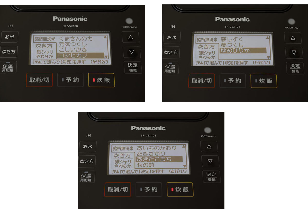 「Wおどり炊き」では、幅広いお米の品種の個性を生かして、最適に炊き分けられる “銘柄炊き分けコンシェルジュ” 機能を搭載する。最新の「VSX108」でも、50銘柄の炊き分けに対応。今年本格デビュ ーの福井県産「いちほまれ」や宮城県産「だて正夢」などの銘柄も美味しく炊ける。実際に複数の銘柄を炊き分けてみたが、それぞれの個性の違いに驚いた。
