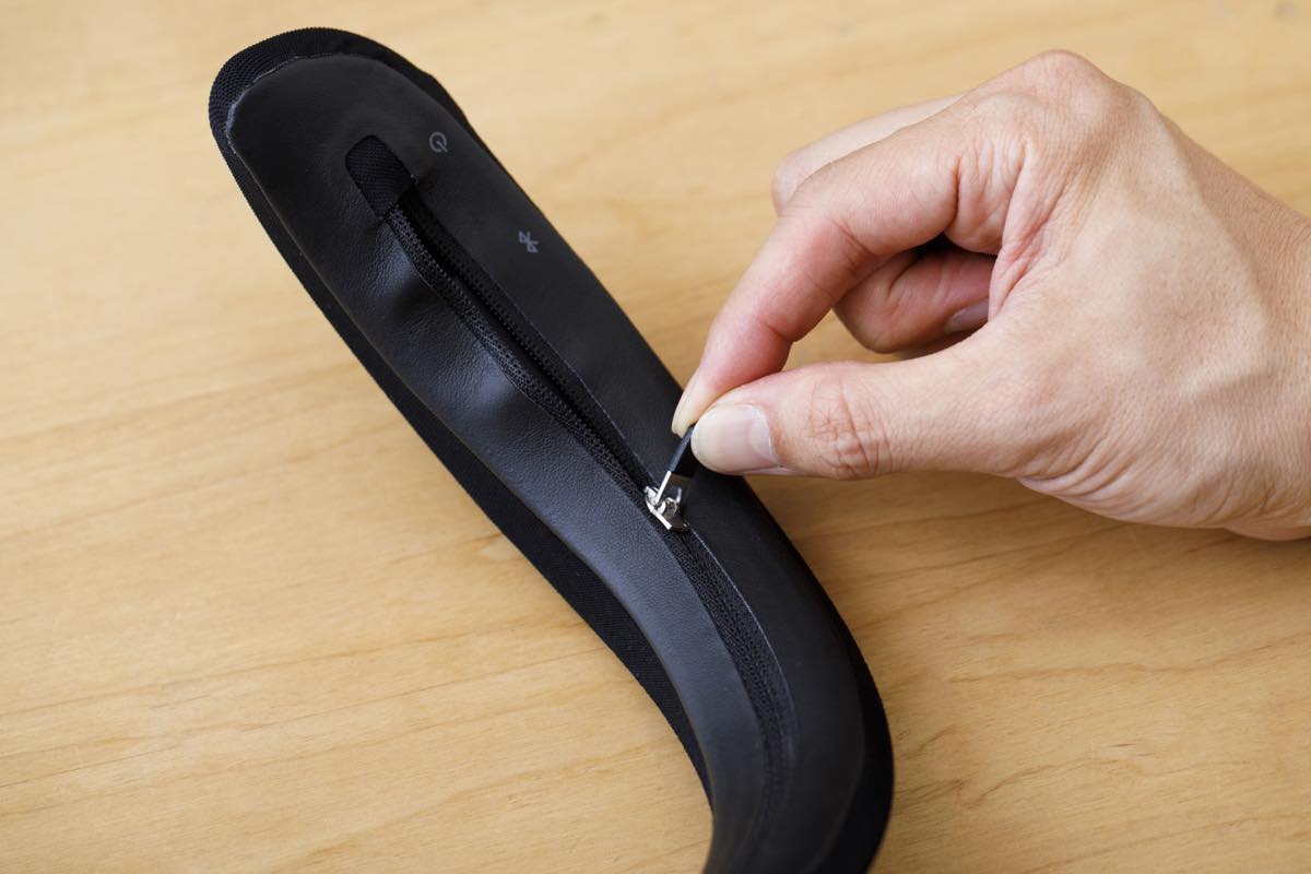 ▲スマホとBluetoohで接続するのがメインの使い方。滑らかな肌触りのカバーはファスナーを開閉して着脱できる。カラーはシックなブラック