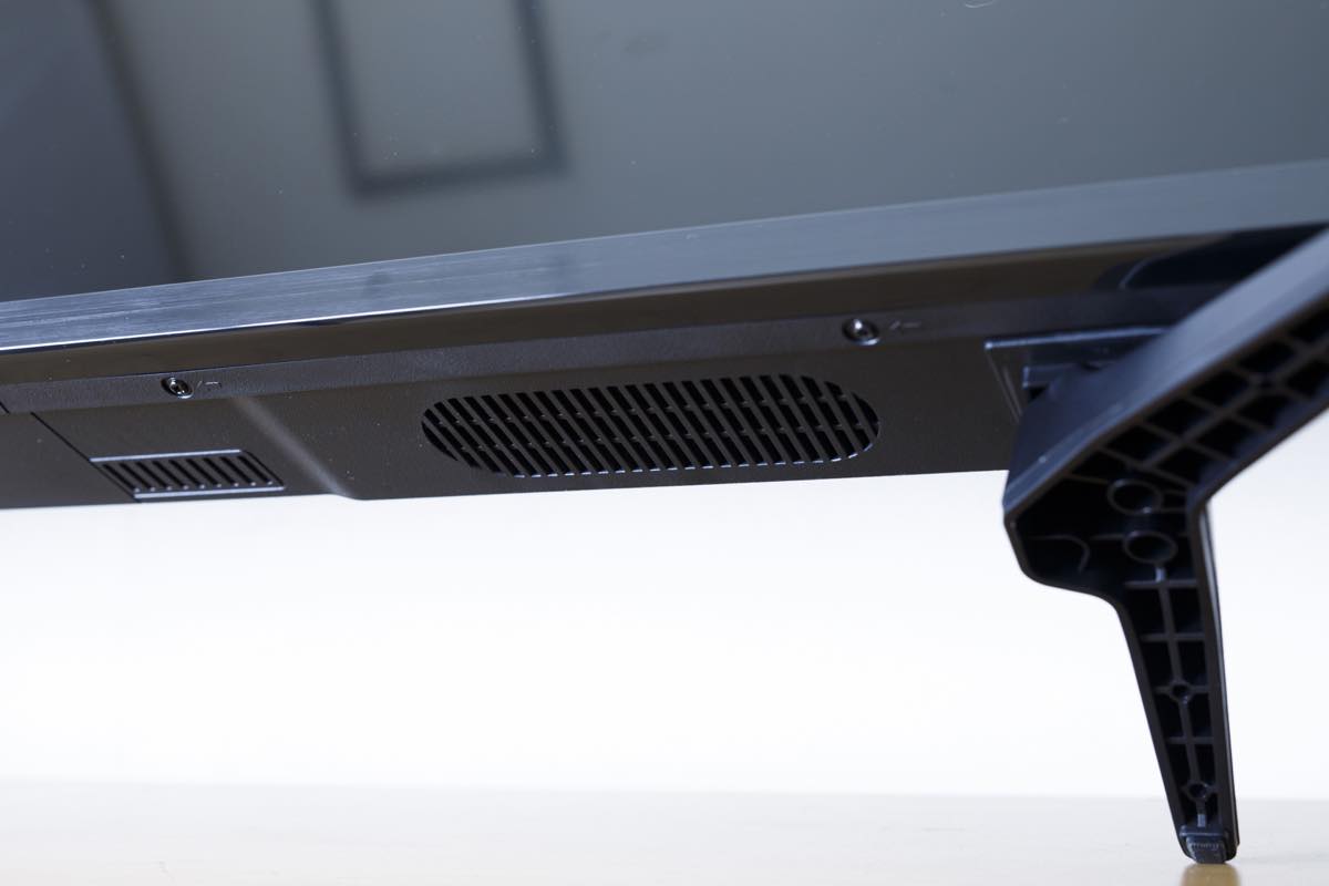 ▲シンプルな機構で簡単に取り付け可能なスタンドを、両サイドに採用。“こもらない音”は下部のスピーカーから出力する