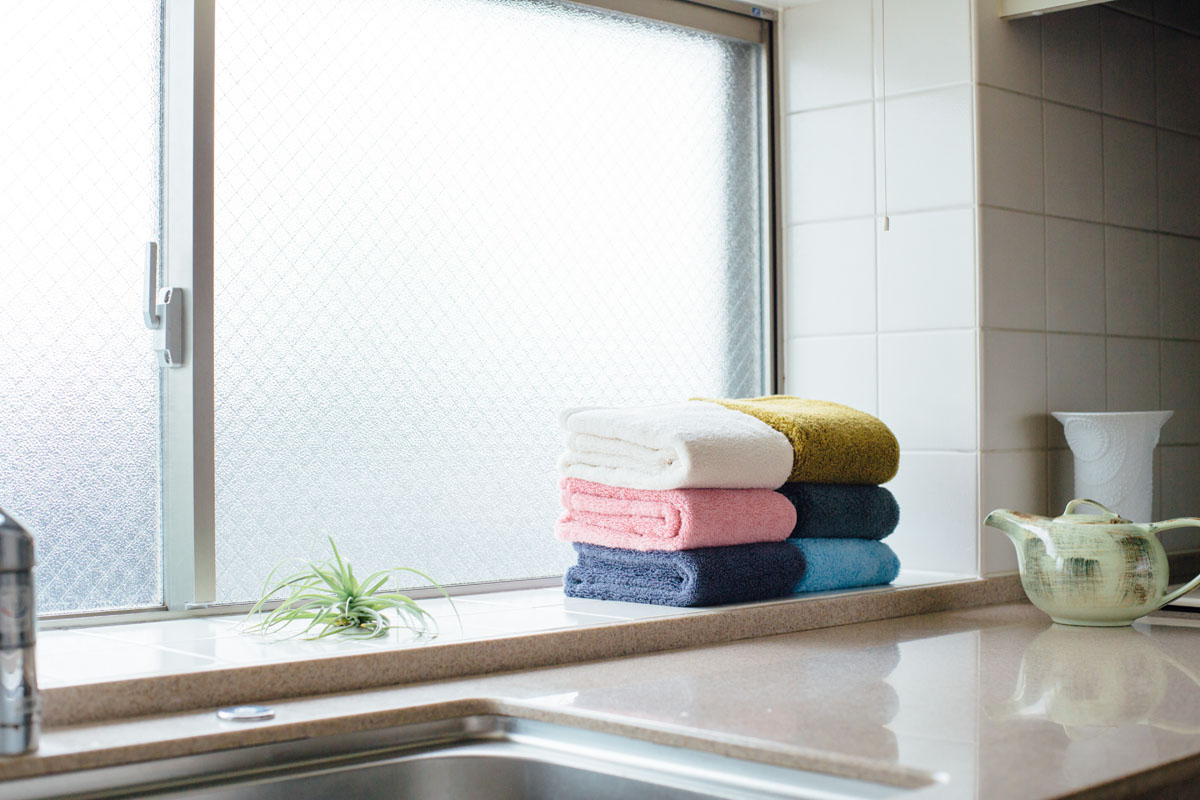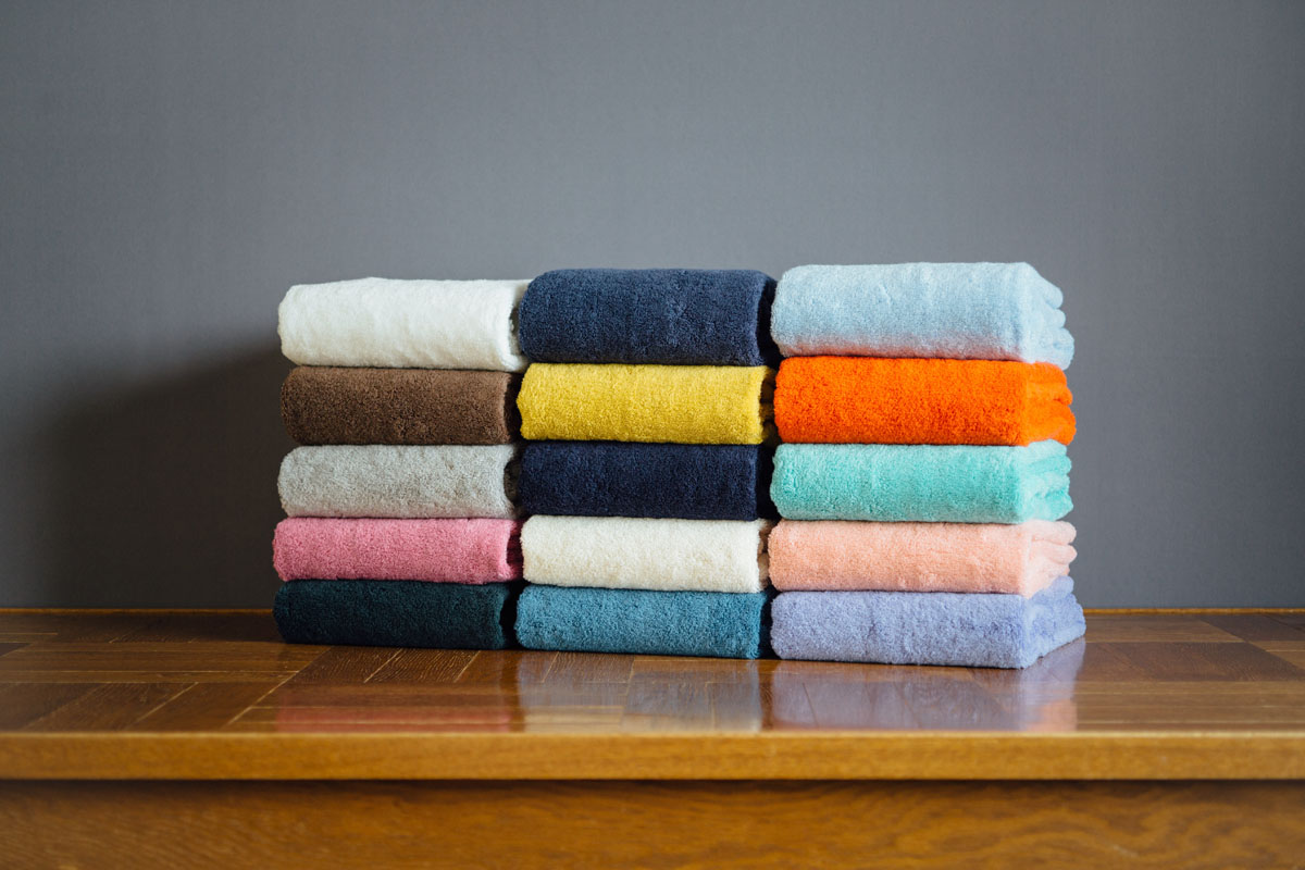 究極のベーシックタオル「ハウスタオル」(800〜4500円)は糸の紡績から自社で行っている。「お値段的にもいちばんお求めやすいタオルです」。独自の技術とノウハウで究極の黒を表現した「BK100」(1800〜8000円)、2本の糸を撚合わせることでやわらかさと耐久性を実現させた「ZUTTO」(1600~6000円)など、さまざまなアイテムがラインナップ。カラーバリエーションも豊富だ。