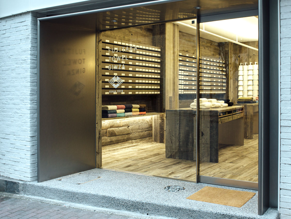 複合商業施設「GINZA SIX」から裏手に位置する店舗は、約30平方メートル。店舗には、風よけフェンスに使われた古木を内装に使用し、洗いざらしのタオルの風合いを表現している。店舗デザインや「藤高」が大正時代に使用していた商標「世界鶴」を再構築したロゴデザインなど、「今治タオル」の老舗の世界観を体感するのもなかなかオツである。