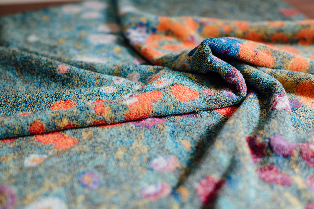 色を先に染めることで、クリムトの名画をタオルで再現した、世界初のフルカラージャカードタオル「五彩織り クリムト『農家の庭』」(8000円)はまさにアート! 一見の価値がある。