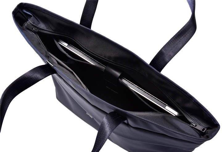▲PCやタブレット収納に最適なクッション材入りポケットを備える。トートではめずらしい