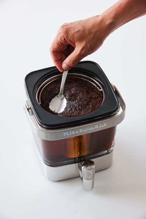 濃縮コーヒー液を抽出するタイプで、水1000㎖に対し、使用するのは粗挽きのコ ーヒー粉が250g。フィルターにコーヒー粉を入れ、冷たい水を回し入れる。水面よりも上にコーヒー粉がある場合は、スプーンなどで押さえ、しっかりと水に浸す。