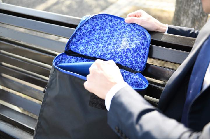 日本企業のプロジェクトから生まれた、和柄デザインのバックパック。コバルトブルーの亀甲模様を裏地に採用。リュックハーネスにUSBポートを搭載する。