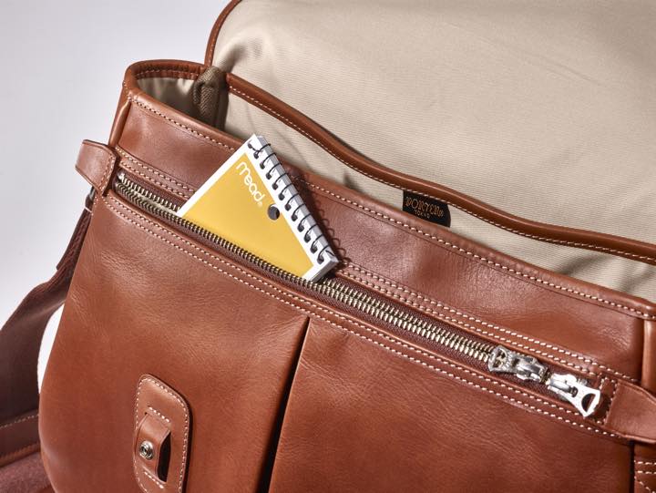 ▲フロントに小物が入れられるファスナーポケット、メイン収納部には、ペン差しやオープンポケットを配置。背面には新聞が入るポケットもある