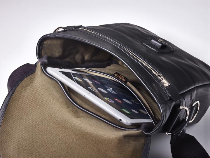 ▲小物の収納に便利なフロントのファスナーポケットに、メインコンパートメントにはタブレット端末などが入るサイズのオープンポケットが付く