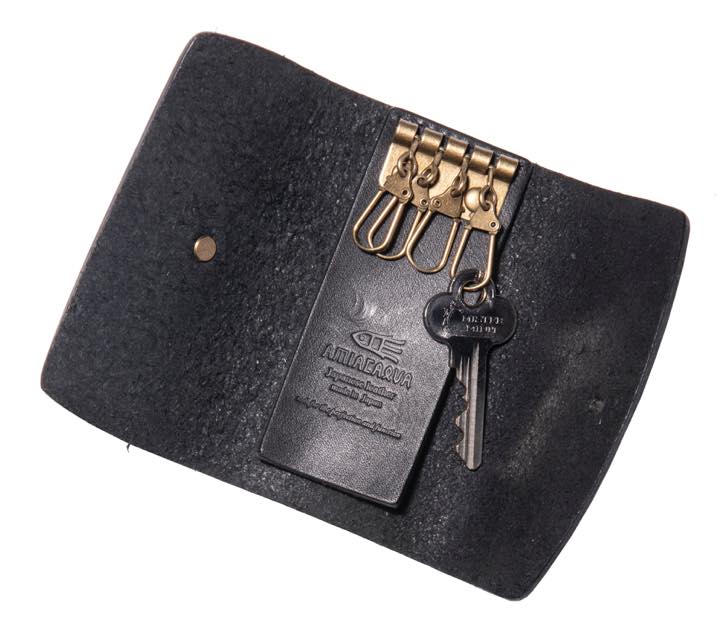 基本的に、鞣された一枚のヌメ革に金具を付けただけのシンプルな構造のキーケース。4本の鍵が収納できて、包み込むようにまとめて持ち歩ける。