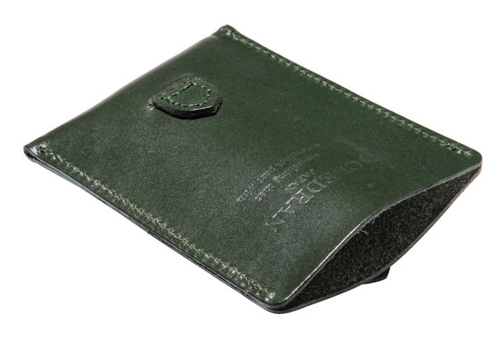 背面に配置されたレザーストラップを引くと、名刺などのカードがスライド式に取り出せる。スーツの内ポケットにも収まりが良いので、名刺交換時に話のきっかけになる。