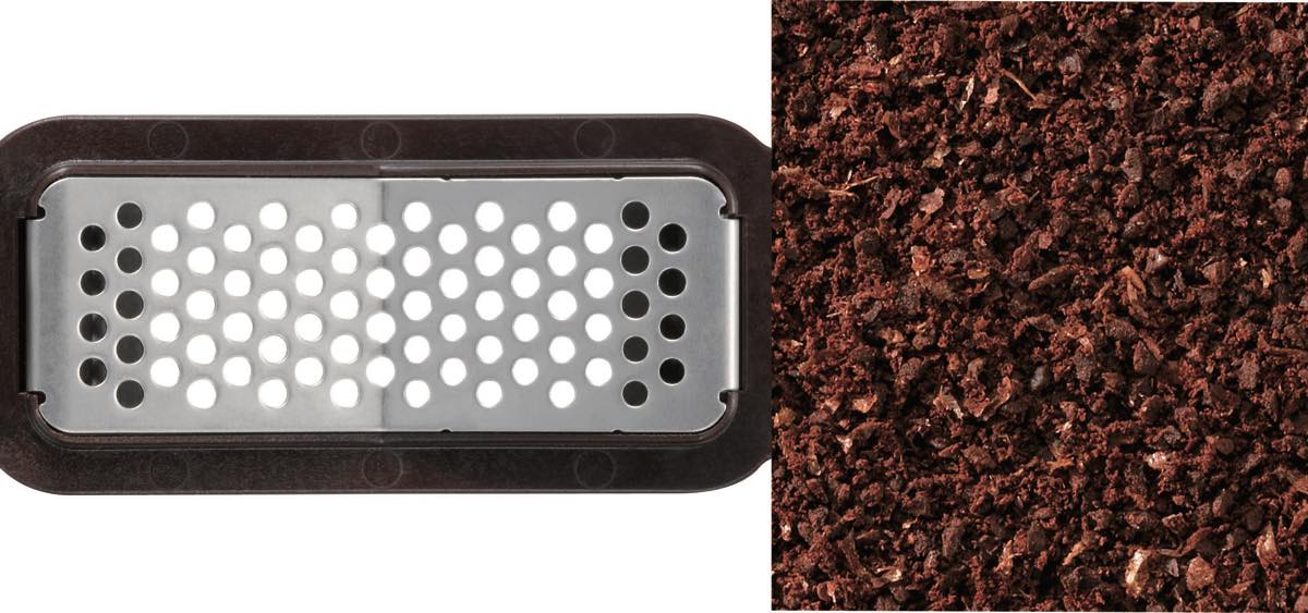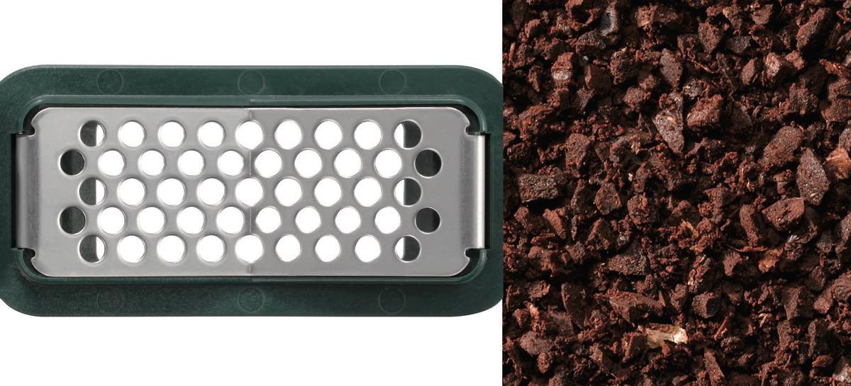 ▲2つのフィルター搭載で、「粗挽き」「中細挽き」と豆を挽き分ける。カフェインレスのデカフェ豆にも対応したコースを搭載