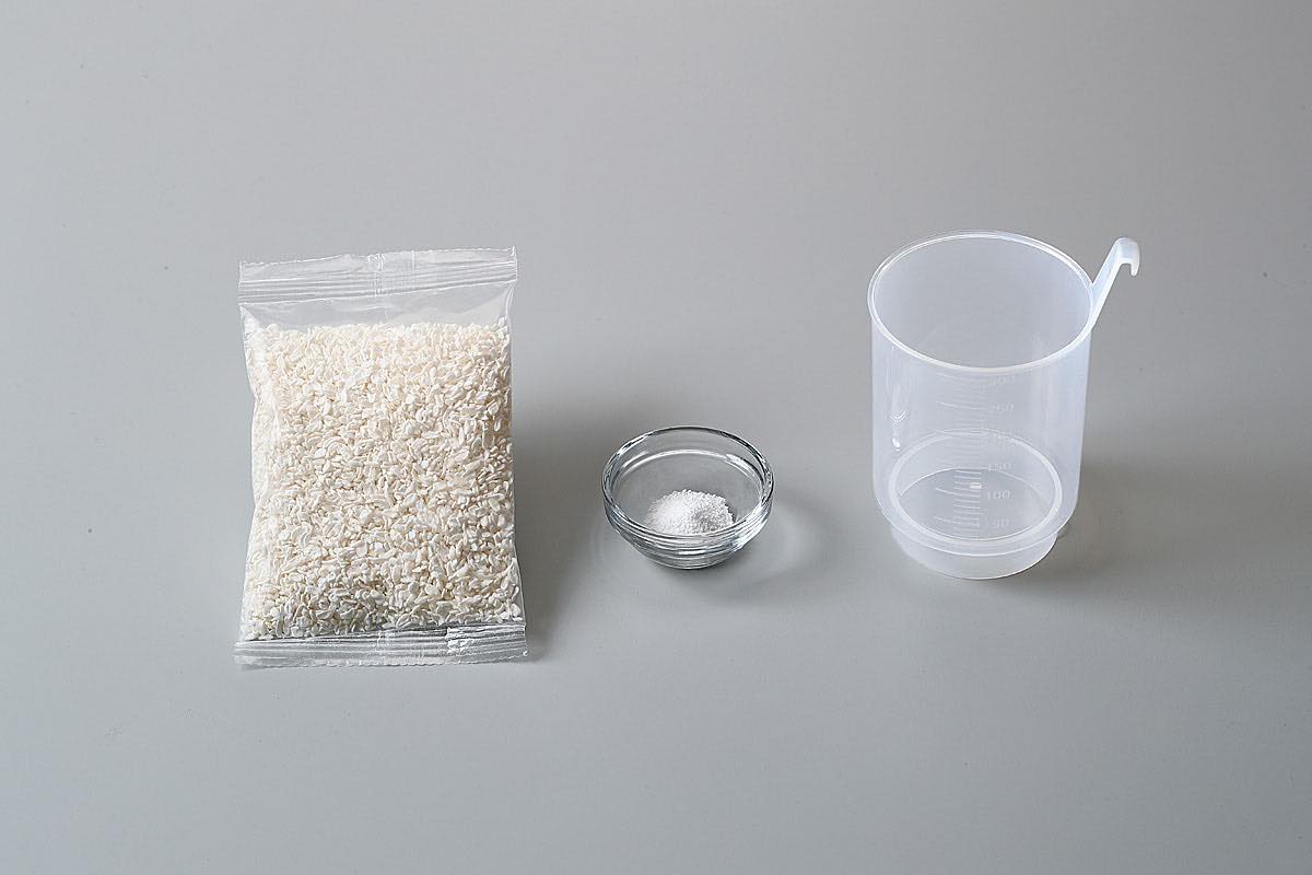 ▲タピオカなどで作った「とらひめ」と水を加えて炊くだけ。炊き上がりに仕上げ粉をかけて蒸らすと、ご飯に近い粘りが楽しめる