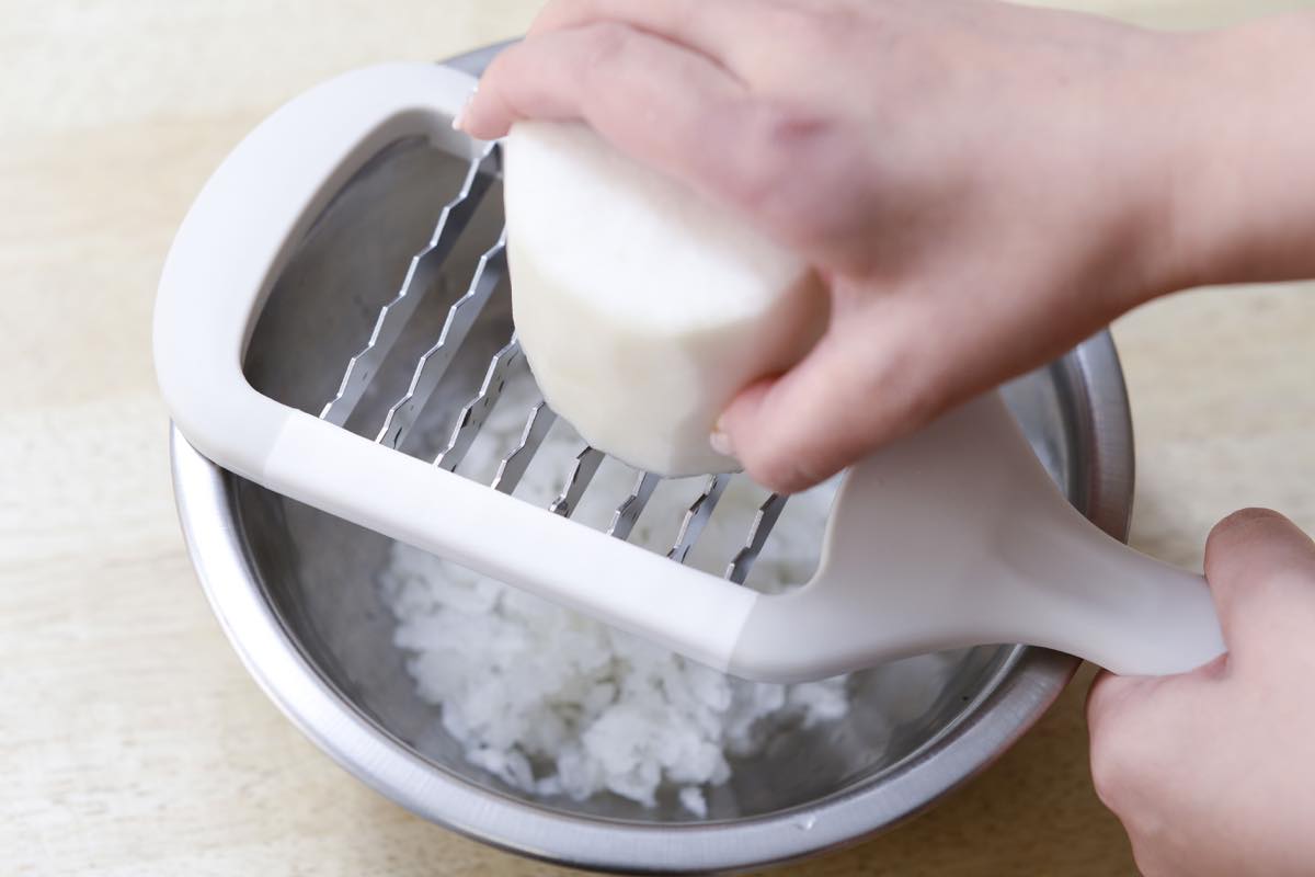 鬼の歯のような形のおろし金で、ザクザク粗い食感におろし、水分が出にくく、栄養分を失いにくいと注目の「鬼おろし」。従来の竹製ではなく金属製の鬼刃が登場し、おろしやすさが格段にUP!