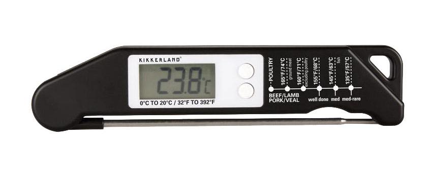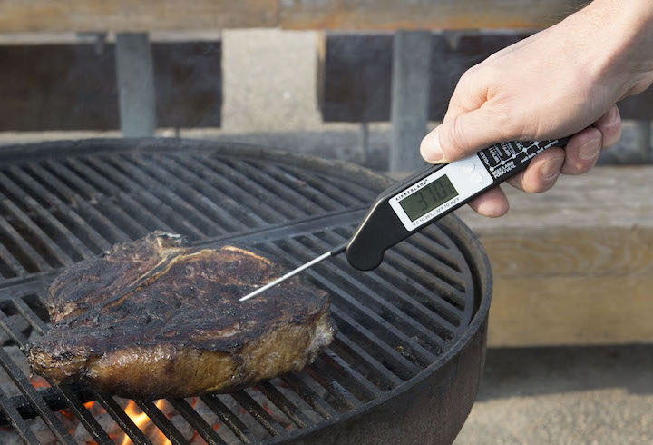 食材に本体を刺して約10秒待つだけで、食材の中心部の温度が計れるサーモメーター。ローストチキンなど厚みのある肉を焼くときに重宝。レアやミディアムなど、好みの焼き加減が狙える。