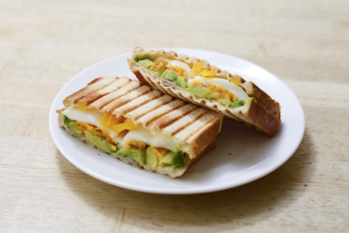 ▲食パンの片面にマヨネーズをぬる。余熱したプレートにパン、ベーコン、アボカド、ゆでたまご、パプリカを順に重ね、さらにパンをのせる