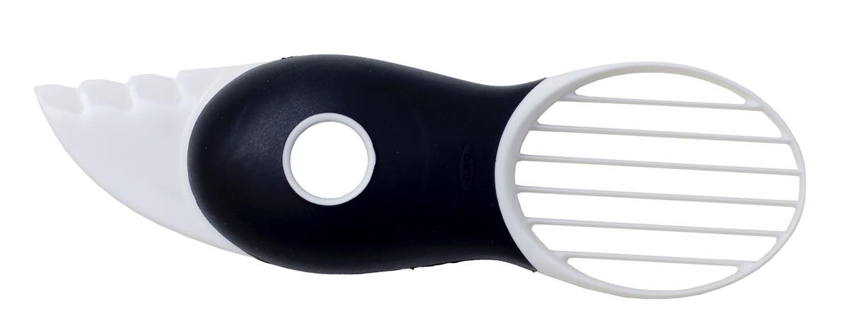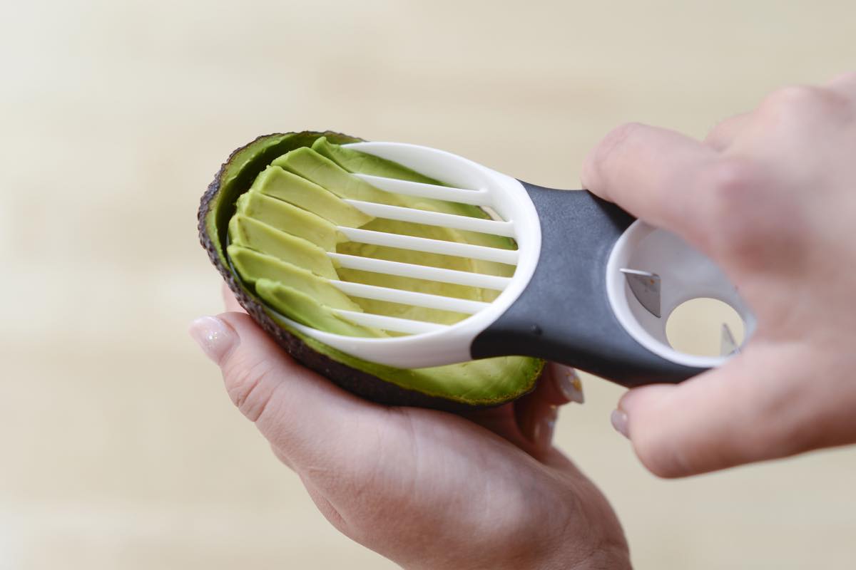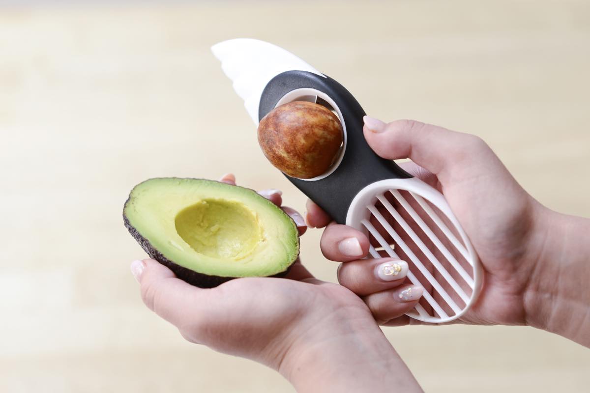 皮と実のカット、種取り、スライスがこれ1つでできるアボカド専用スライサー。ナイフを突き刺して怖い思いをしたリ、実を崩したりなどの心配はなし。サビずに衛生的なプラスチック製。