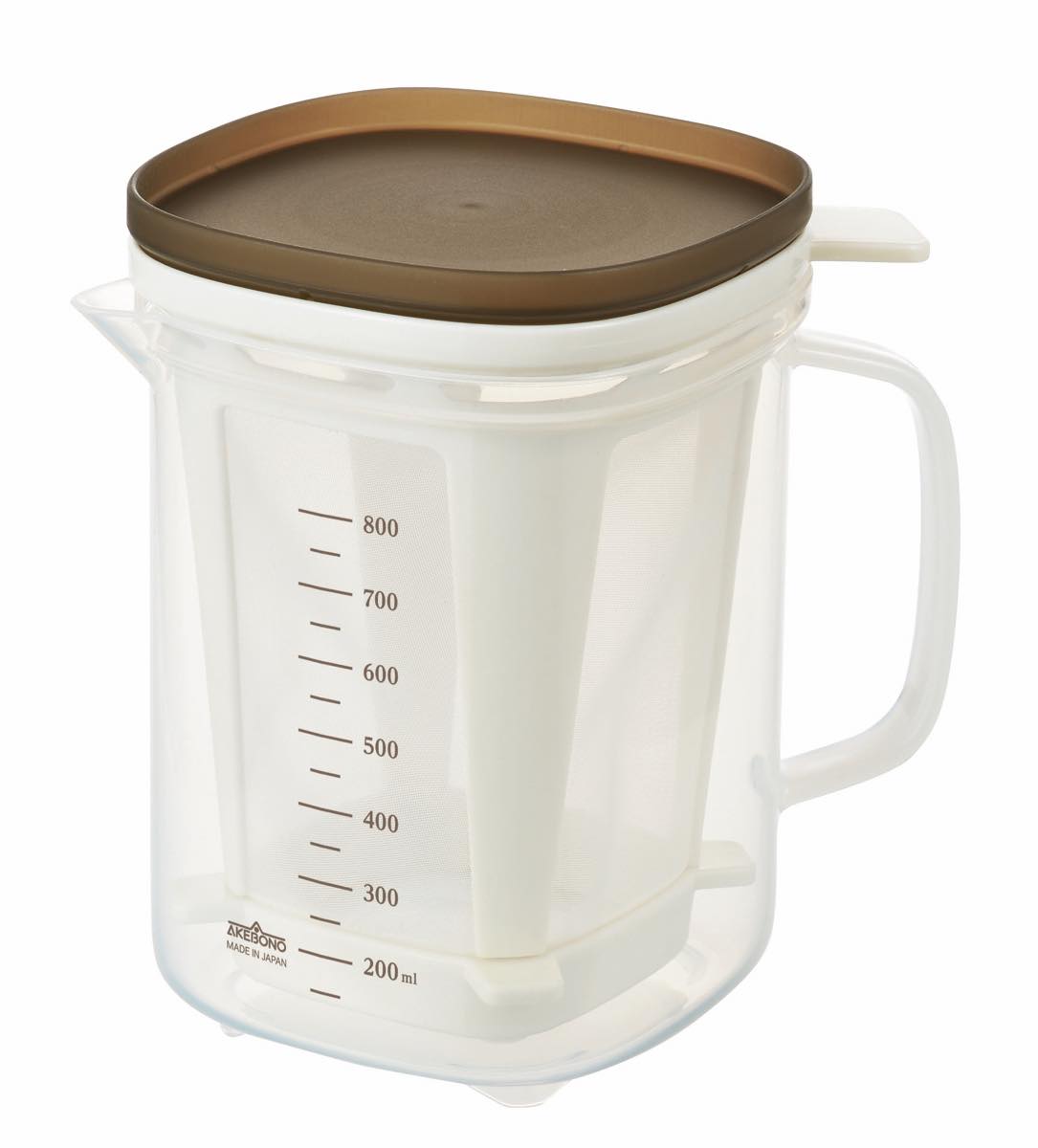こし網にかつお節などを入れ、水を注いだ容器にセットして電子レンジで加熱。こし網は密度の高いメッシュで澄んだ黄金色の出汁が簡単にとれる。容器は目盛り付きで計量&保存カップにもなる。