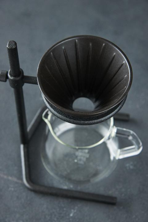 素材からデザイン、仕上げまで細部にまでこだわりをもって作り込まれたセット。理科の実験道具のようなスタンドは鋳物製で、無骨なデザインが男心をくすぐる。可動式で、1人用のカップからサーバーまで幅広く対応する。ドリッパーは磁器製。