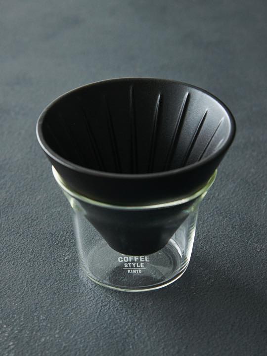 ドリッパーは1つ穴で、2人用の円錐式ペーパーフィルターに対応。セットには、外したドリッパーを置く、ガラス製のホルダーも付属する。抽出量に達したときに意外と困る、ドリッパーの受け皿問題を解決してくれる便利なアイテム。