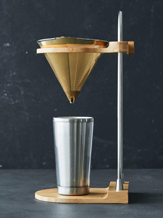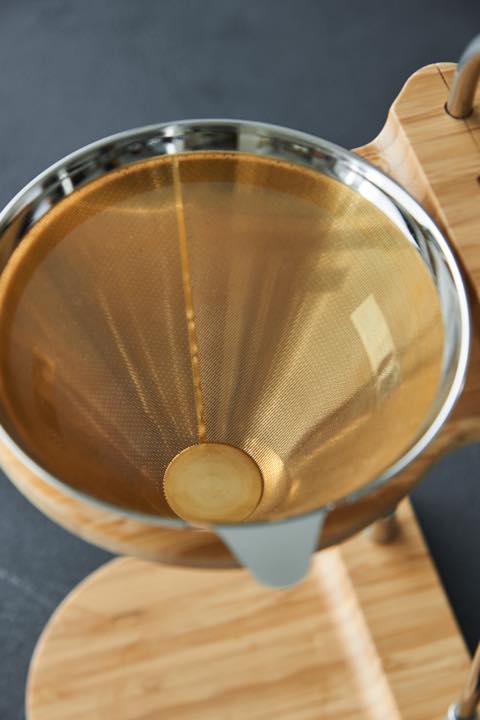 フィルターは、科学変化しにくいゴールドメッキ。ペーパーに比べてメッシュは粗く微粉を取り除けない反面、オイルをそのまま抽出できるため、豆本来の味を堪能できる。スタンドは可変式で高さを変えられ、携帯マグに直接ドリップも可能だ。