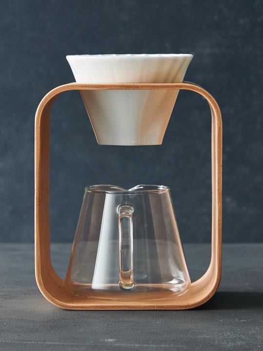 上質な生活空間を演出する同社「SNOWTOP」シリーズのひとつで、曲げ木を使用したドリッパースタンドと、磁器製ドリッパー、耐熱ガラスポットの組み合わせ。3種の素材の組み合わせはシンプルでさわやか、インテリアによく馴染む。