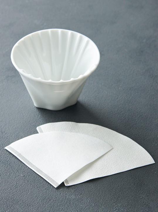 独特な形状の磁器製1つ穴式ドリッパーは、リブ(内側の突起)を高めに設定。コーヒー液がドリッパー内に溜まりにくいため、えぐみが抽出されにくい構造になっている。電子レンジにも対応する耐熱ガラスポットには磁器製の蓋が付く。