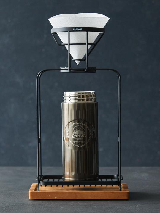 スタンドは、オリジナルのコーヒードリッパーだけでなく、他メーカーのさまざまなドリッパーにも対応。トレイを下げれば、世界初のボトル内部にテフロン加工を施した専用のコーヒーボトル(420ml/3240円)に直接ドリップすることもできる。