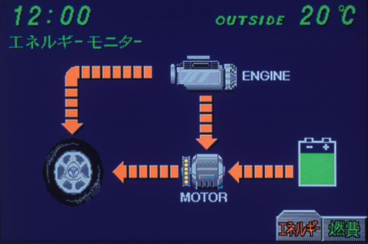 ▲センターコンソールのモニターには、エンジン+モーターの両方で駆動中といったシステムの状況がリアルタイムで映し出されていた