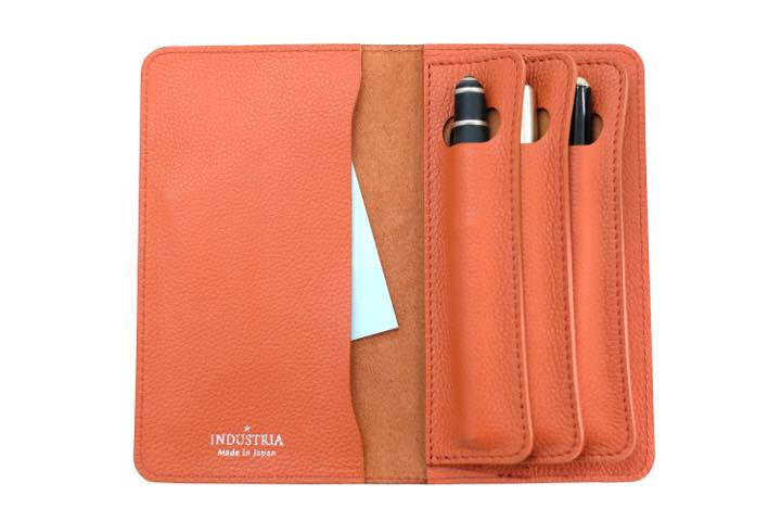 インダストリアの「セパレートペンケース」は、しなやかで風合い豊かなシュリンクレザーを使っています。傷がついても目立たず、使い込むほどに味が出てくるので、気軽に持ち歩けます。ペン一本一本をホールドしてくれるので、大切に扱いたい万年筆を安心して入れておけますね。ペンホルダーの反対側には、薄いメモ帳やスマートフォンを入れるのに適したポケットが用意されています。
