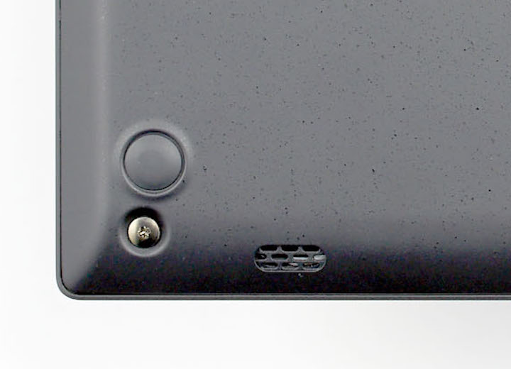 底面前方の左右にはBOXスピーカ ーを備える。本体が反り上がった斜面部分から音が出るようになっているので、音がこもらず前方に広がる。
