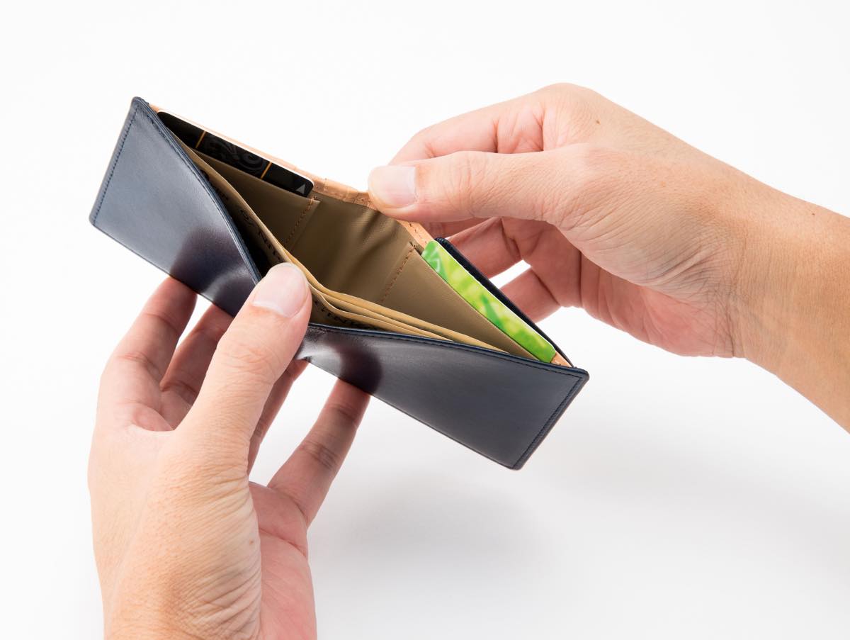 ▲スリムな片マチ設計ながら、4つのカードポケットと小銭入れを備える。札は仕切りの間に2つ折りにして収納する