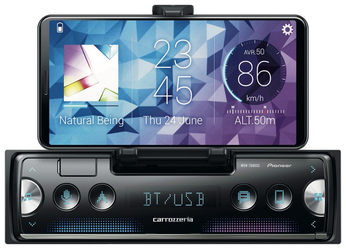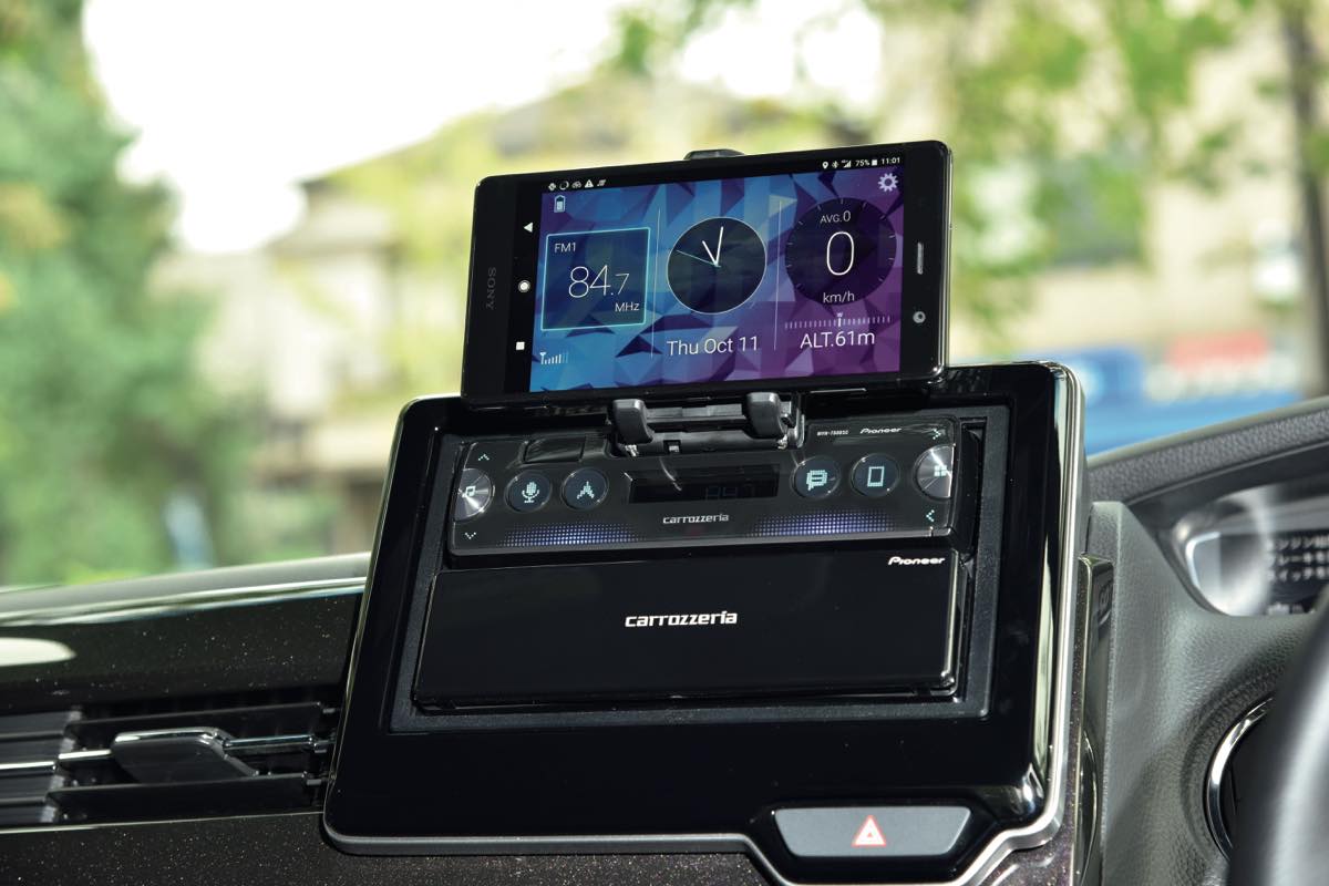スマホ連携をメインに開発された新スタイルのカーオーディオは、スマホスタンドを内蔵。専用アプリをインストールしたスマホとBluetooth接続により連携し、前面パネルのボタンを押すことでカーナビ、音楽、メッセージなどのアプリが立ち上がる。また、音声認識機能で各種操作を声で行うことも可能だ。