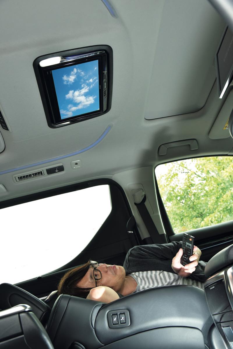 業界最大級の13.3型フルHDパネルを搭載した後席モニターで、開閉方法やモニター設置面を従来のモデルとは逆にした「バックフリップ」機構を新搭載。これにより収納時も映像が視聴できる「エニタイムビジョン」を実現し、ドライバーの後方視界も妨げにくくしている。