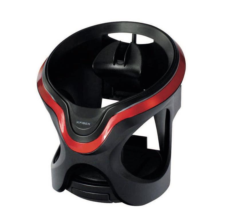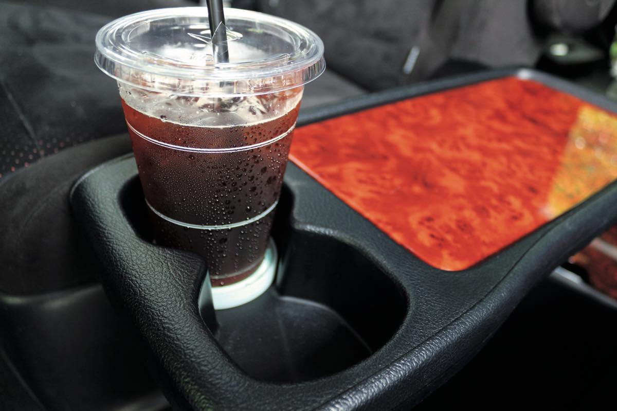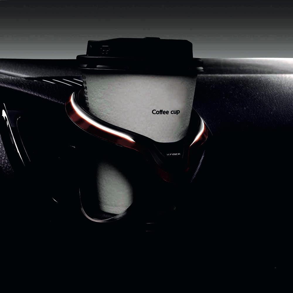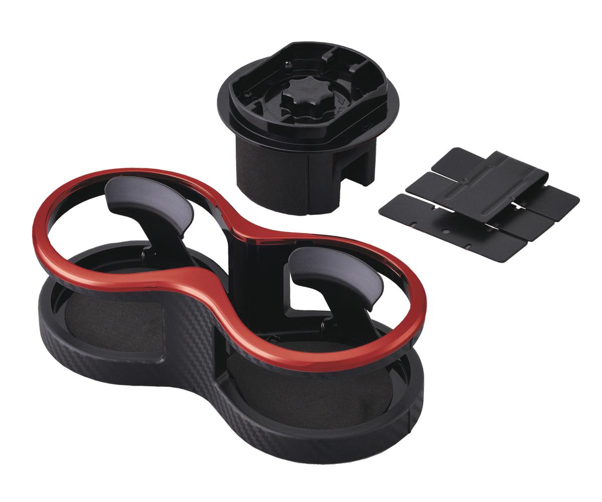 ファイバーLEDとコイン電池を内蔵。ドリンクを置くとLEDが光り、夜は幻想的な雰囲気になる。昼もレッドラインの美しい形状を楽しめる。底面はクッション付きで、運転の振動によるカタカタ音を軽減する。