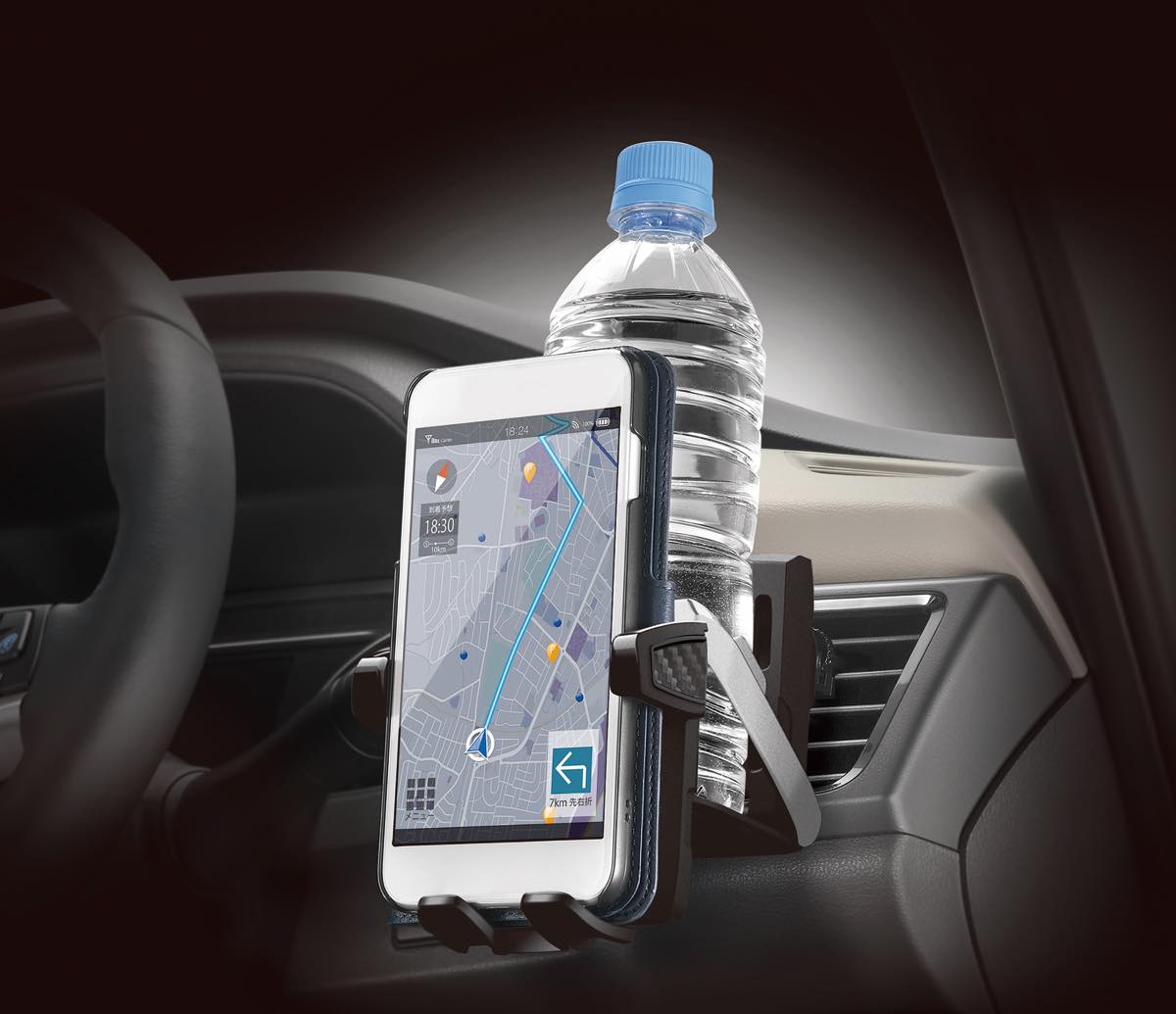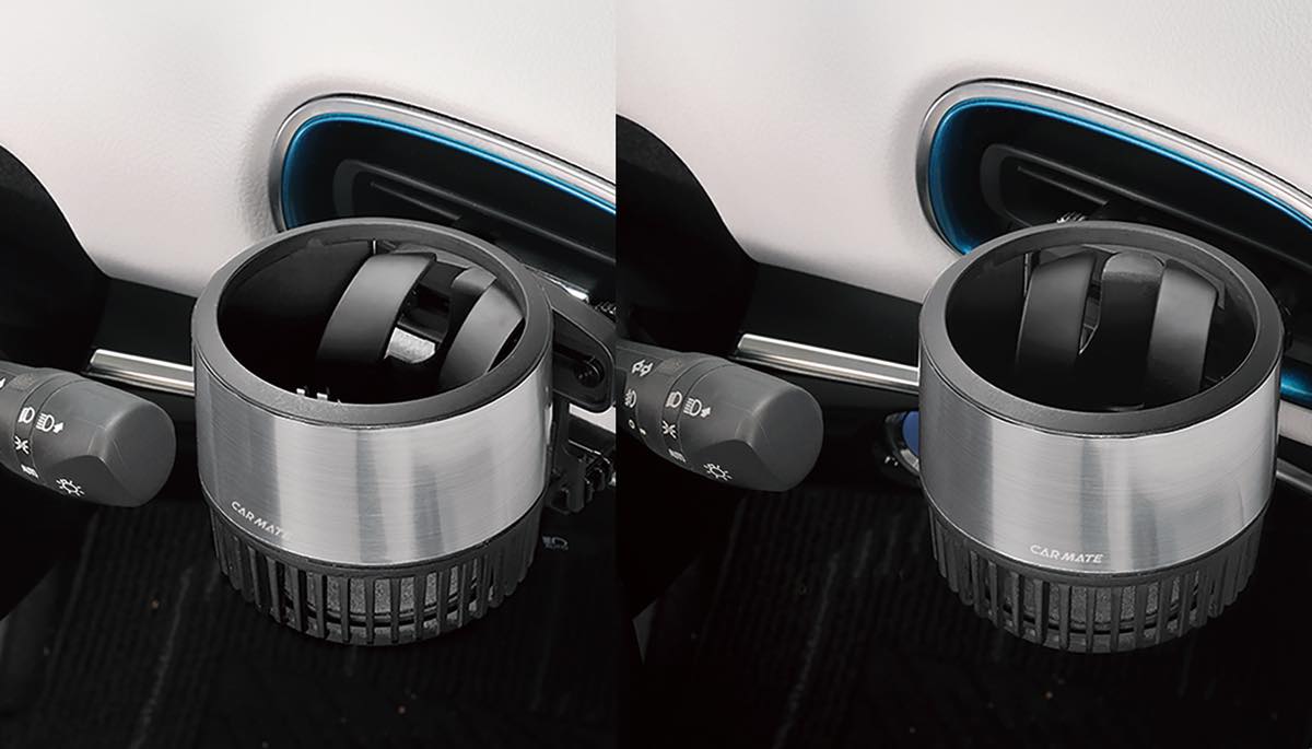 エアコン吹き出し口に装着したあと、左右10度、20度、30度の3段階で少しずつ動かせるので、レバーやドアにぶつかることを防げる。中には2つのバネ付きフラップがあり、ドリンクをしっかりホールドする。
