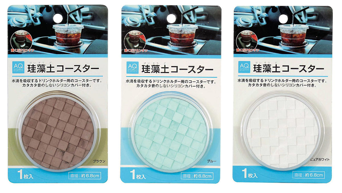 珪藻土で作られたコースターで、水滴をすばやく吸収して乾燥するので表面はいつもサラサラ。ドリンクホルダーの底に置けば、外側に水滴がたくさん付く氷入りのコンビニコーヒーなどを置いても、水が溜まる心配がない。