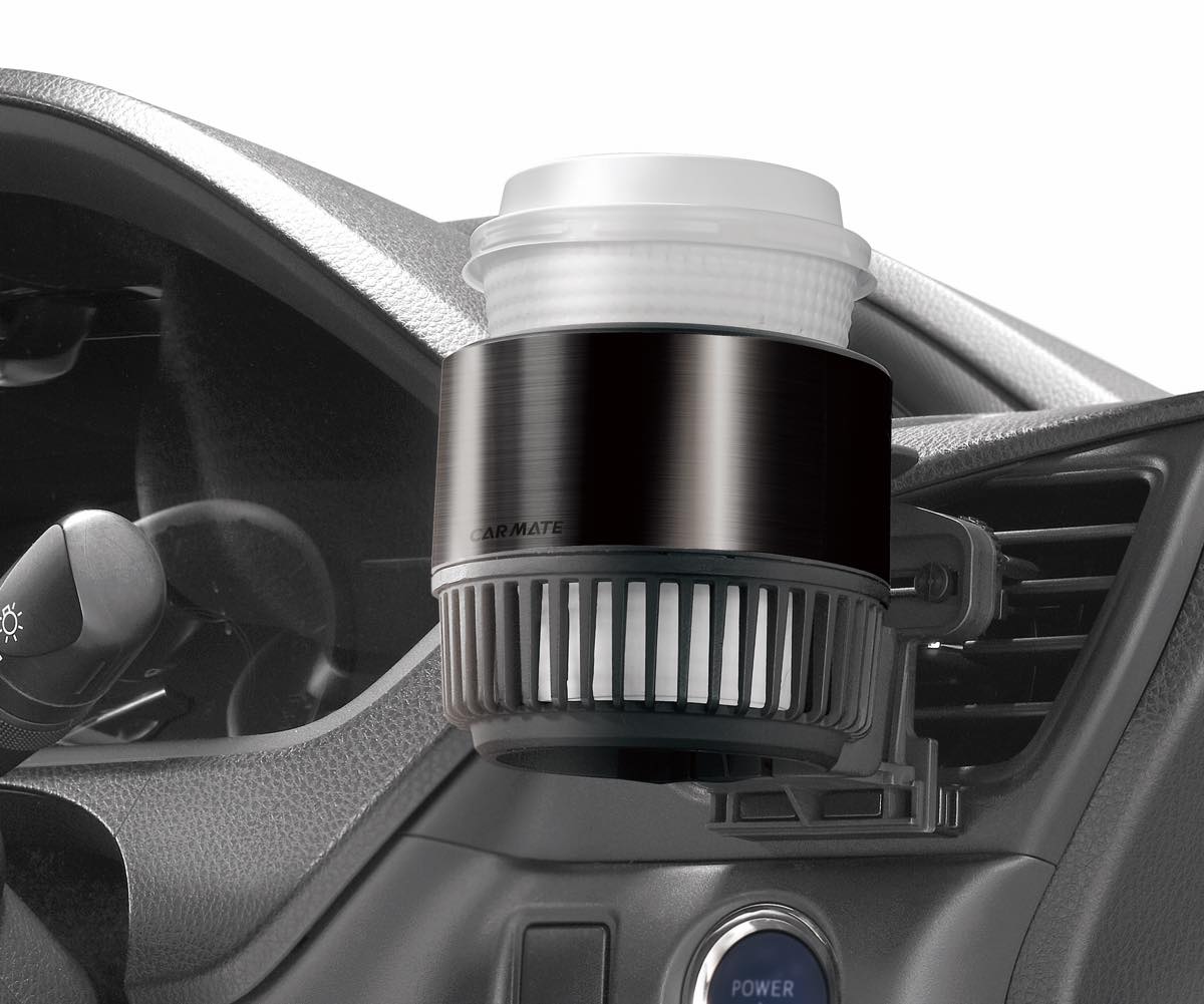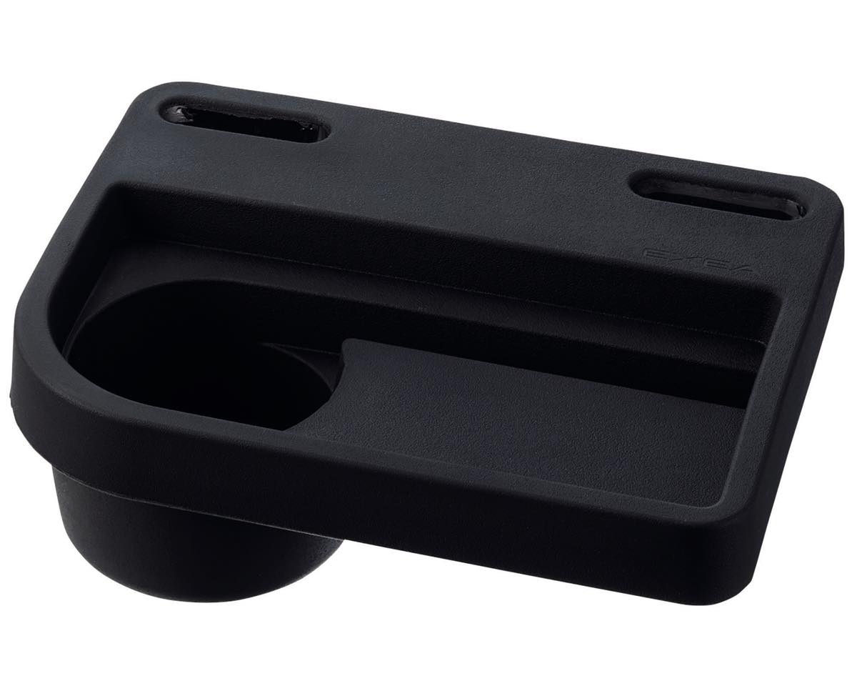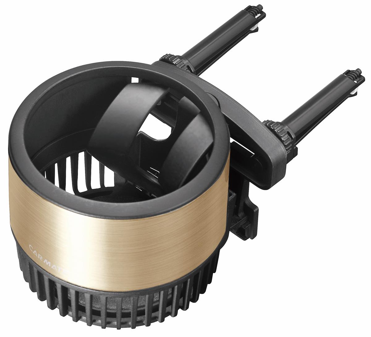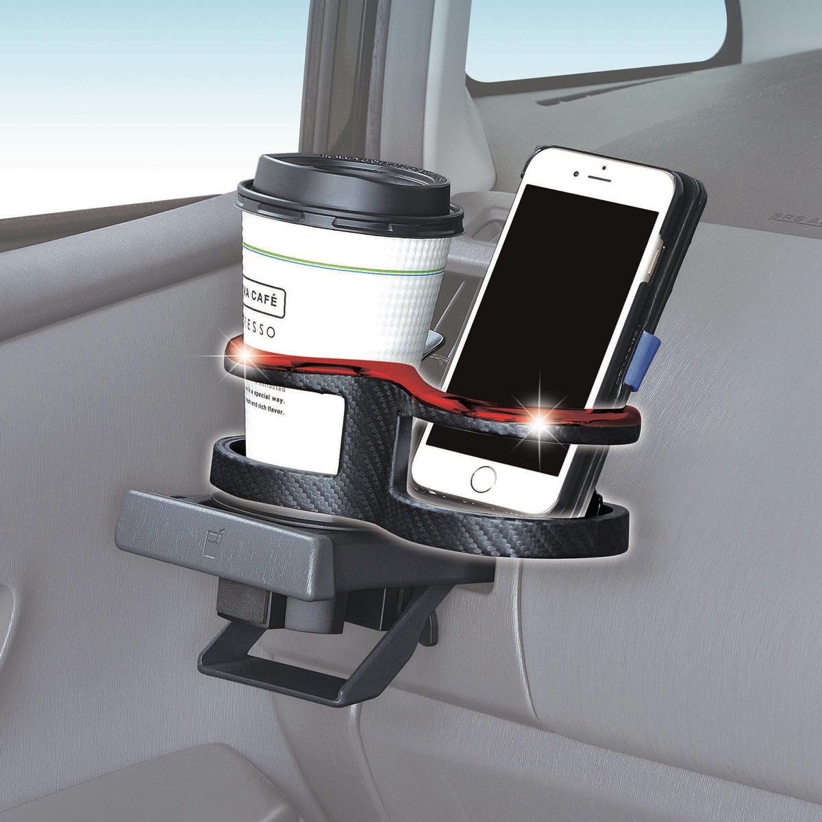 純正カップホルダーに差し込んで固定すると、ドリンクホルダーを2つに増やすことができる。固定位置は右、左、中央にずらせるので、ドアなどに干渉することもない。カーボン柄でスタイリッシュなのも◎