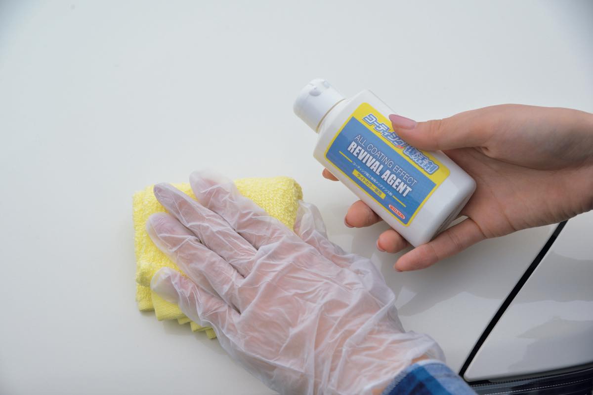 クロスに適量垂らしてからボディを拭くだけ。コーティングしていないクルマにも使える。