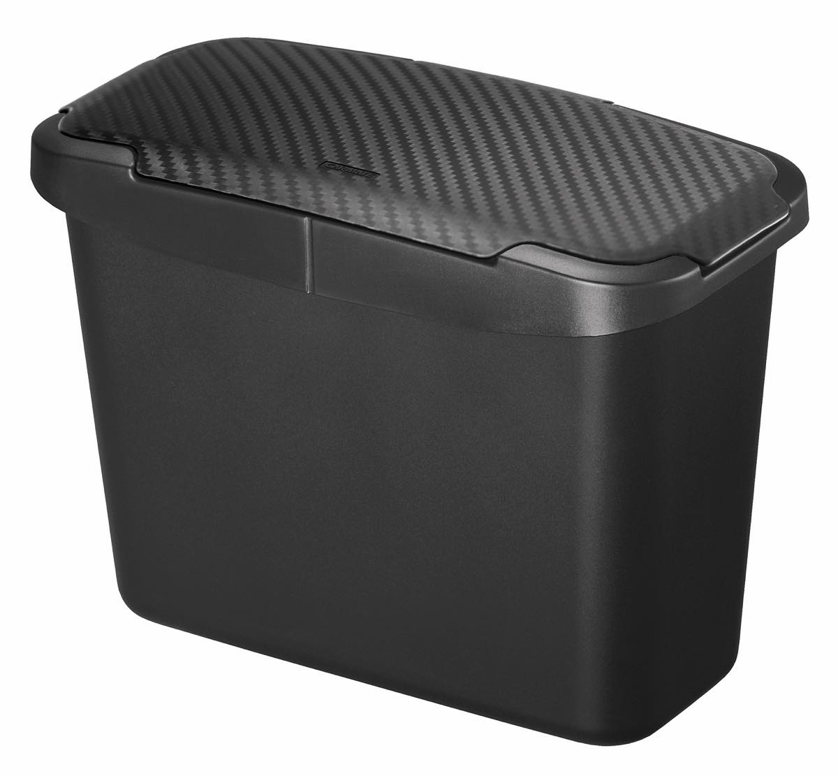 付属のフックを両面テープで貼り付け、本体のゴミ箱を引っ掛けて使用。フタは横側からも縦側からも開くので、ゴミが捨てやすい。カラーはブラックで、フタはカーボン調のデザインで高級感がある。