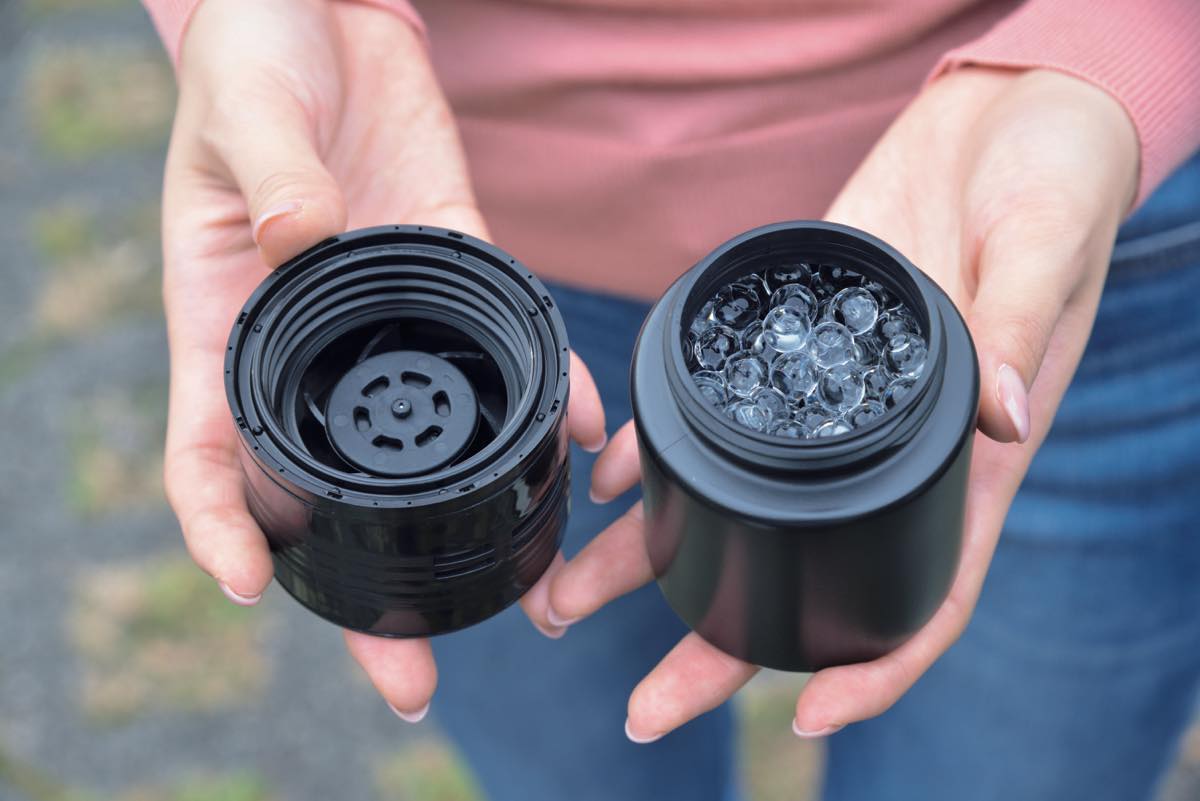 ▲本体には、ボール状のゲル粒がたくさん入っている。単4形乾電池(別売り)×3本が必要